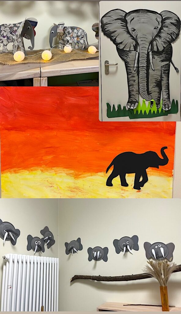 Natürlich durfte auch die richtige Vorbereitung auf eine Safari nicht fehlen: Wir bastelten Ferngläser und lernten, was eine Safari eigentlich ist, was man dafür braucht und worauf man achten muss. Dann war es endlich soweit und unser erstes Tier wurde entdeckt: der Elefant!